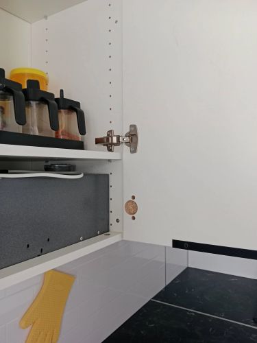 Снимем старые дверцы. Вырежем отверстия под петли, сделаем разметку и прикрепим ручки. Навесим и отрегулируем новые дверцы. Работа займёт 30–60 мин. Будет шумно.