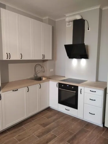 Соберём каркасы, навесим шкафы, дверцы и фурнитуру. Всё отрегулируем. Установим, мойку с сифоном и смесителем.