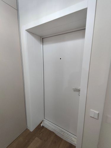 Установим дверной добор и запеним зазор под ним. Работа займёт 1–1,5 часа. Будет шумно и пыльно.
